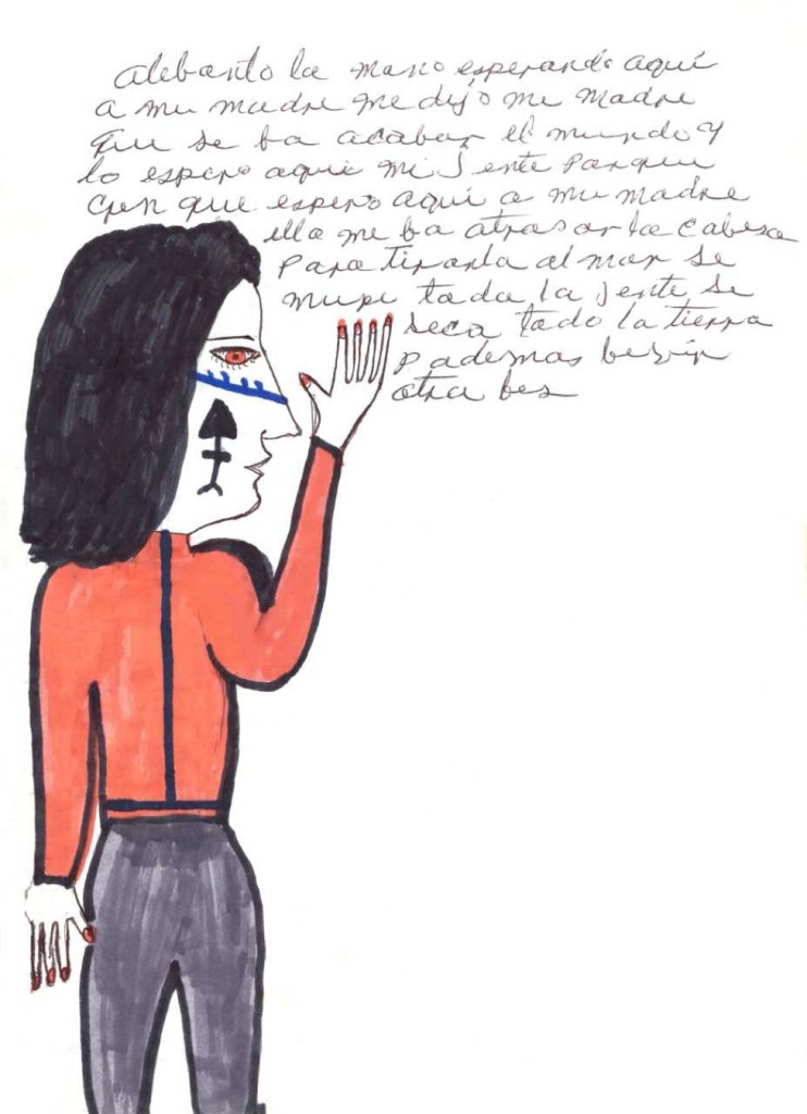 Around the late 1990’s, after she had painted some mono-chord violins for me, I discovered that she had graphic capabilities, and I asked her if she had ever drawn before on paper. She told me she hadn’t and I asked her if she felt capable of making some drawings, and she replied that she would be willing to. So that night I left her my notebook with pencils and pens, and the following morning I had my first 20 drawings by Amalia. From then on, we established an agreement that she would draw school notebooks for me, and when she finished them she would send them to me via mail and I would buy them. I would in the process help her and her family. This took place for many years in which Amalia would send me the drawings, and where she would explain in minute detail the flora and fauna of the region, as well as themes from the Seri mythology and culture. She herself began to incorporate an element of text to, according to her, “explain to Jose” what the images were about. This was a spontaneous collaboration, between her and her son-in-law (Mojarra, who is a mestizo) because she did not know how to write. She died in 2014, during Hurricane Odile which ravaged the Mexican Pacific and Sonora, I calculate she was roughly in her 70’s. She is survived by her husband Adolfo Burgos, her daughters, and grandkids.